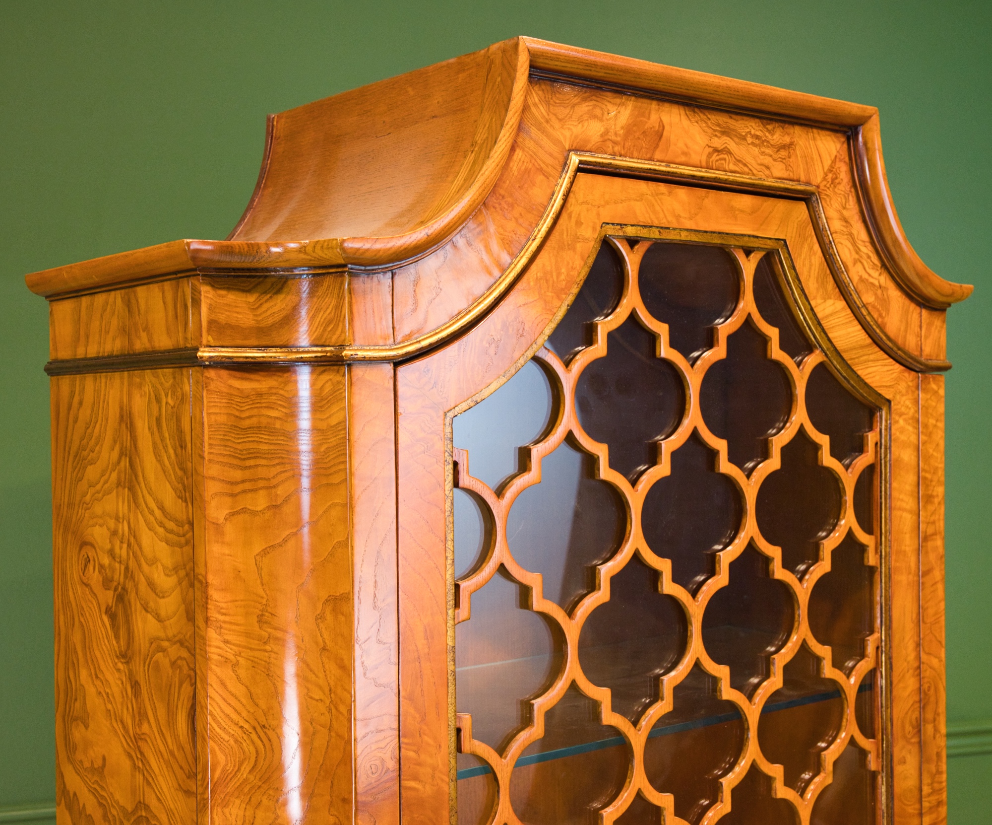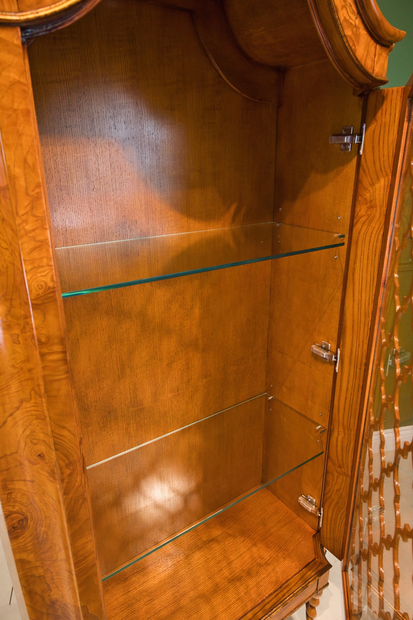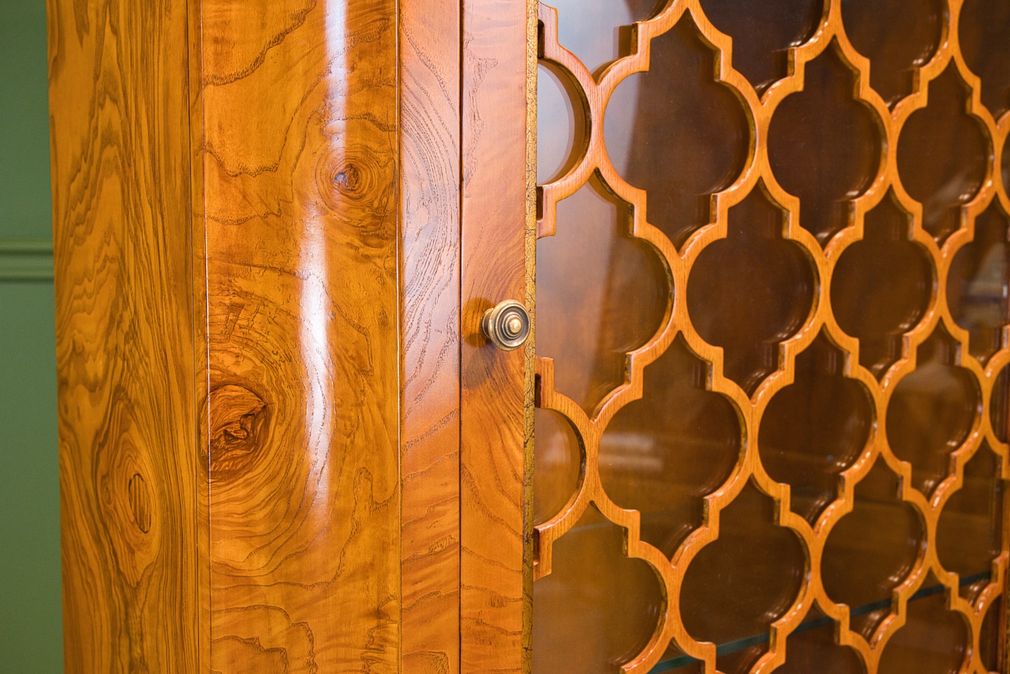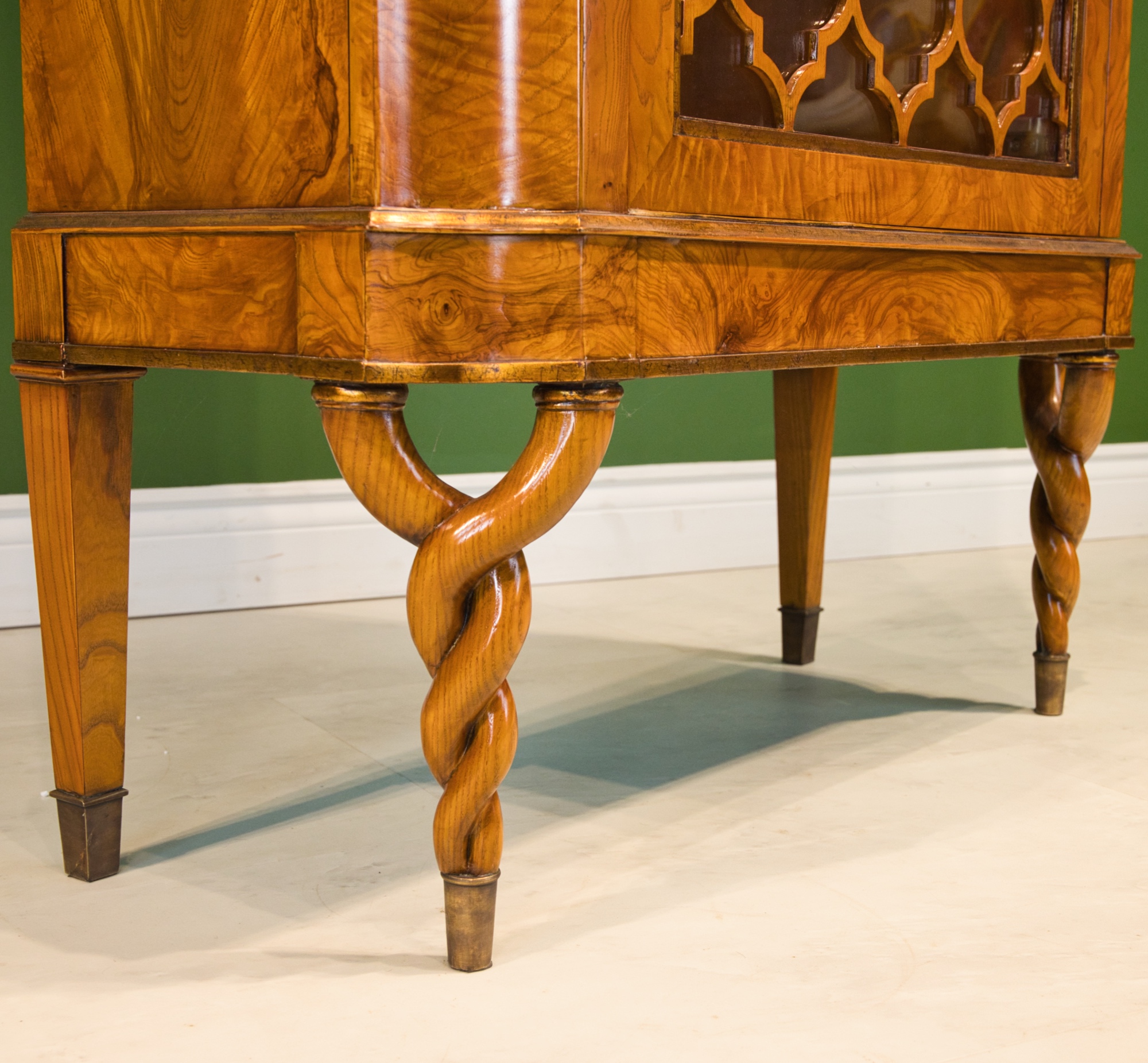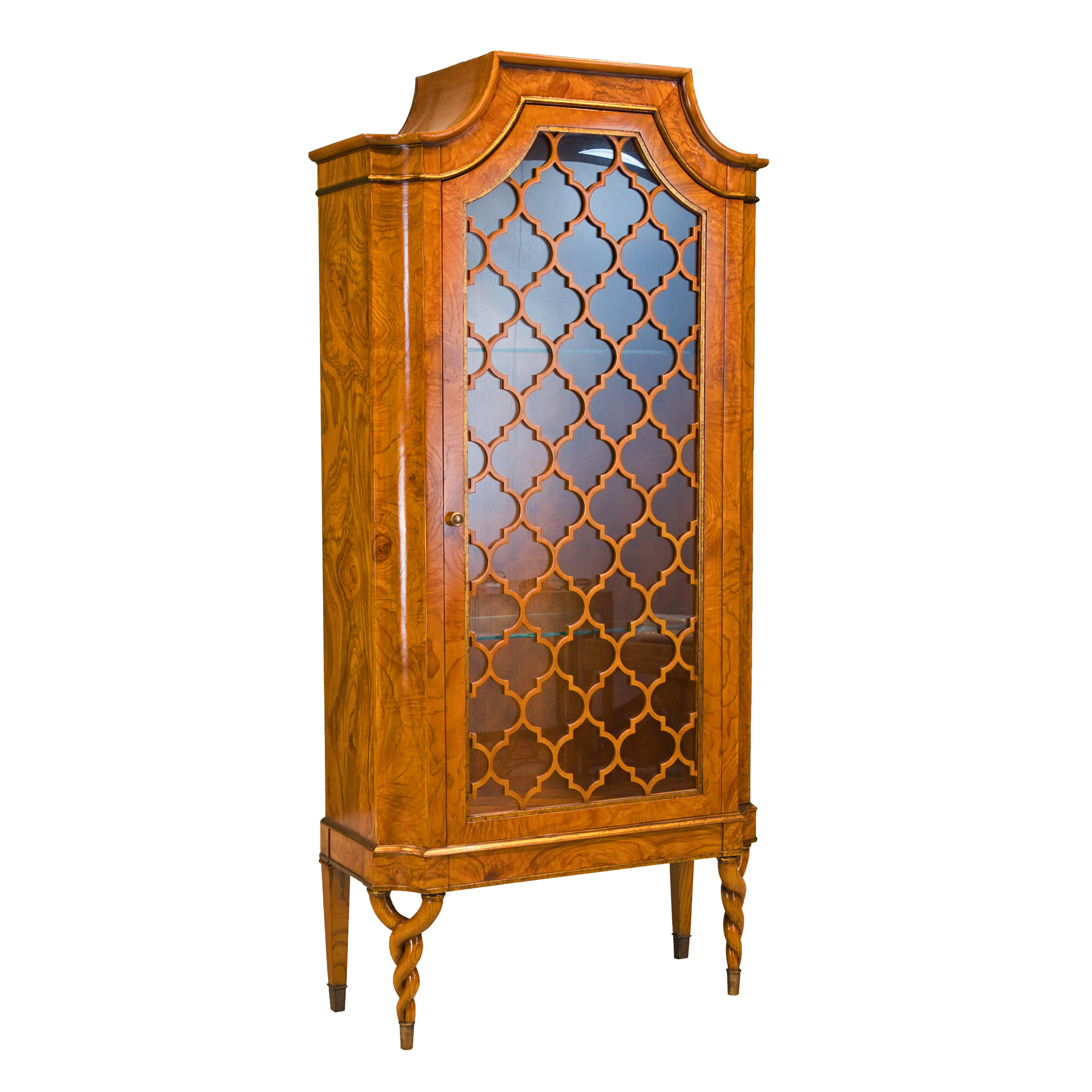 One door cabinet. Unusual display cabinet with twisted legs, made from ash and olive ash veneer. The door can be opened with brass pull. The inside contains 2 movable glass shelves. Matching: dining chair 34430, server 34427, dining table living: one seater 34227, 34228 2 seater, 34229 3 seater, 34231 side table, 34230 coffee table, 34233 medium sideboard, 34444 nesting tables, 34431 TV stand