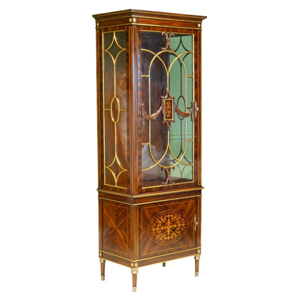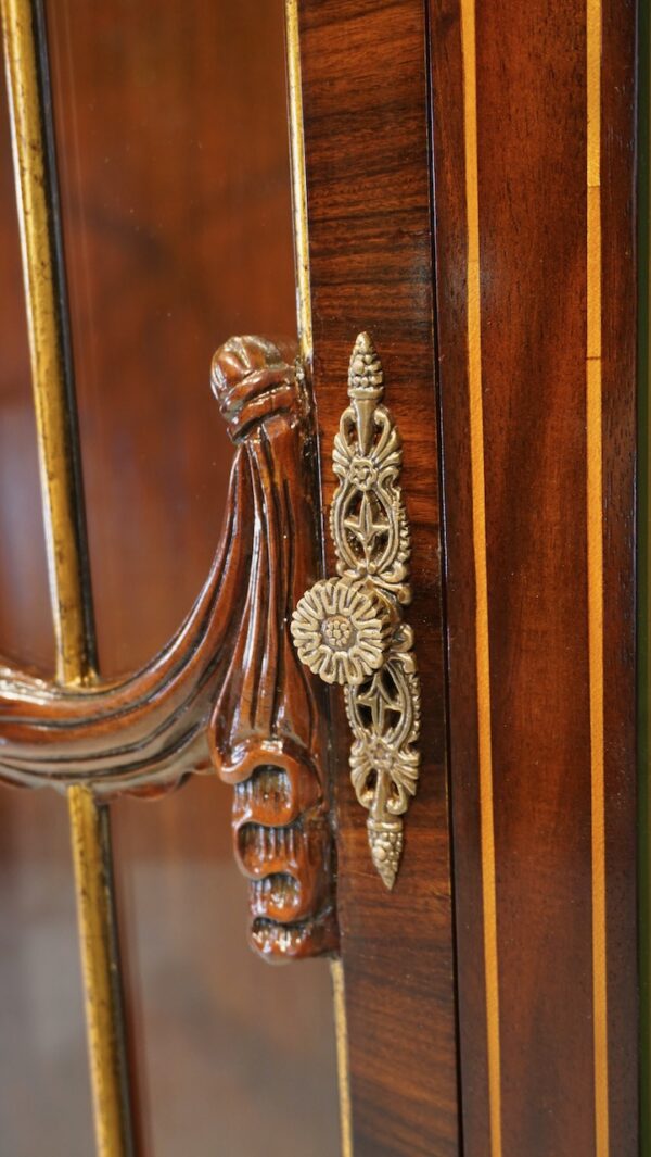 Beautiful Parma display cabinet, made of rosewood and mahogany, with stunning hand applied inlay in the bottom door and accents with hand applied gold leaf accenting. Features brass hardware and 3 glass shelves on the glass display portion with LED lighting in the top. Door opens to the left.