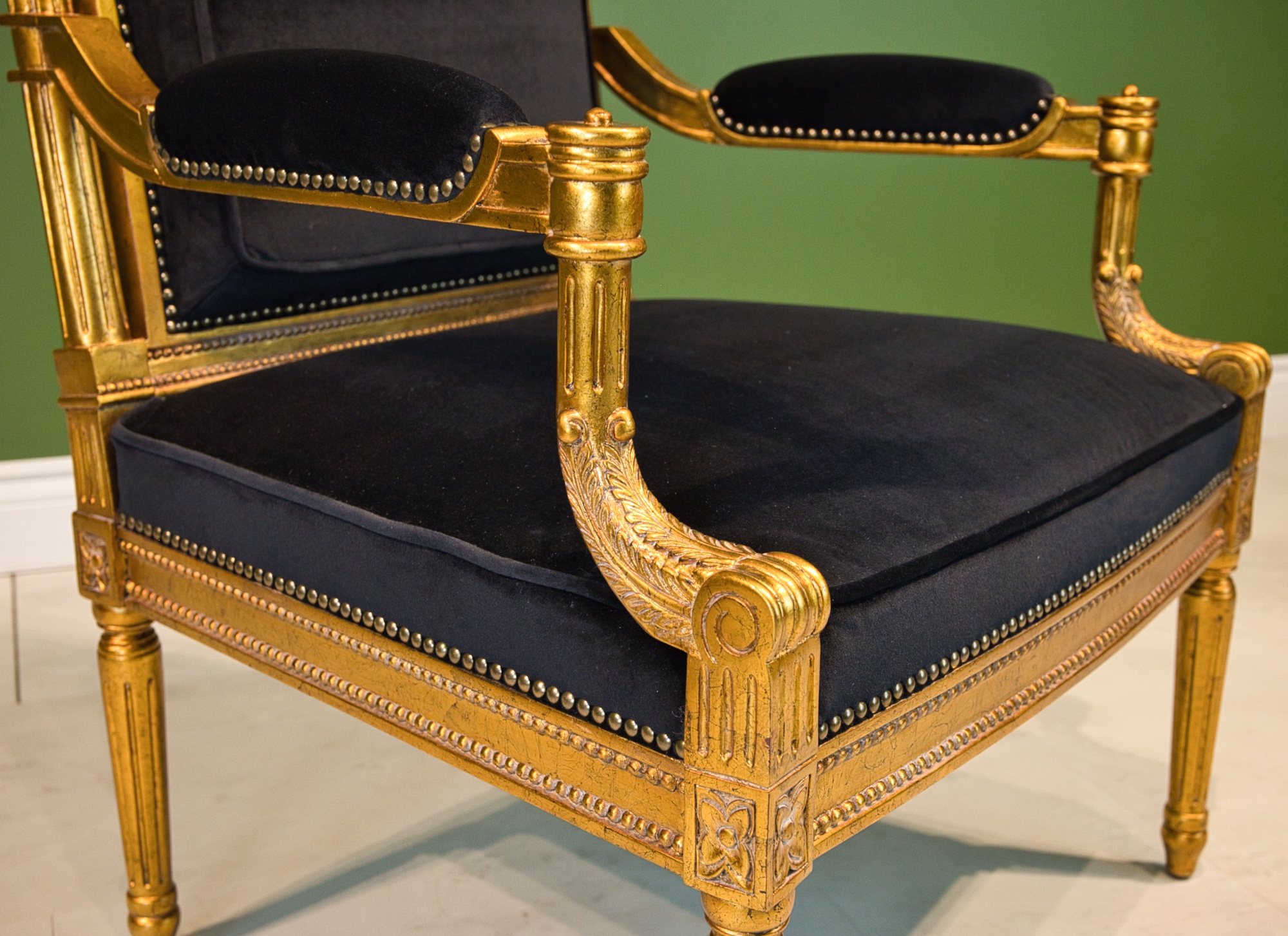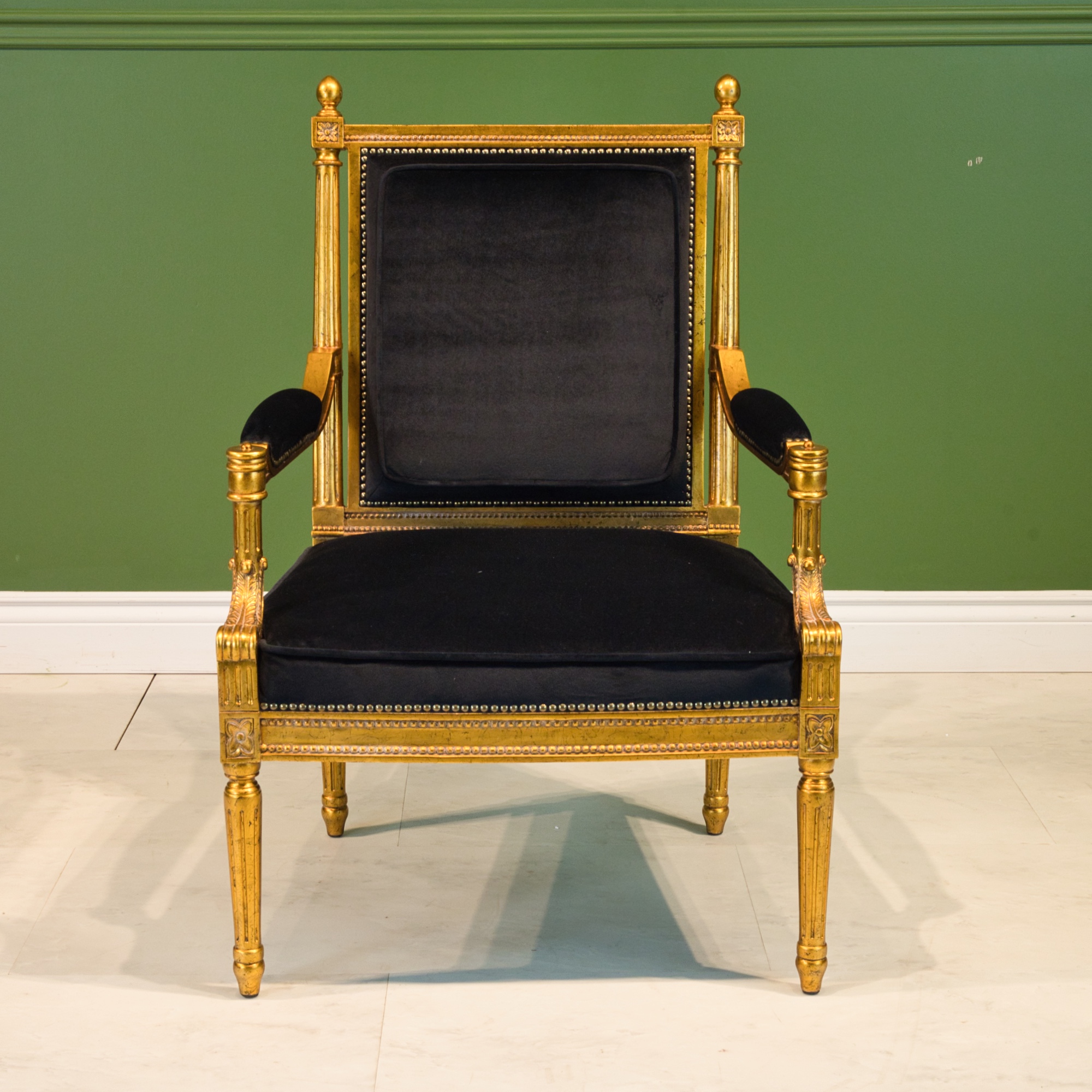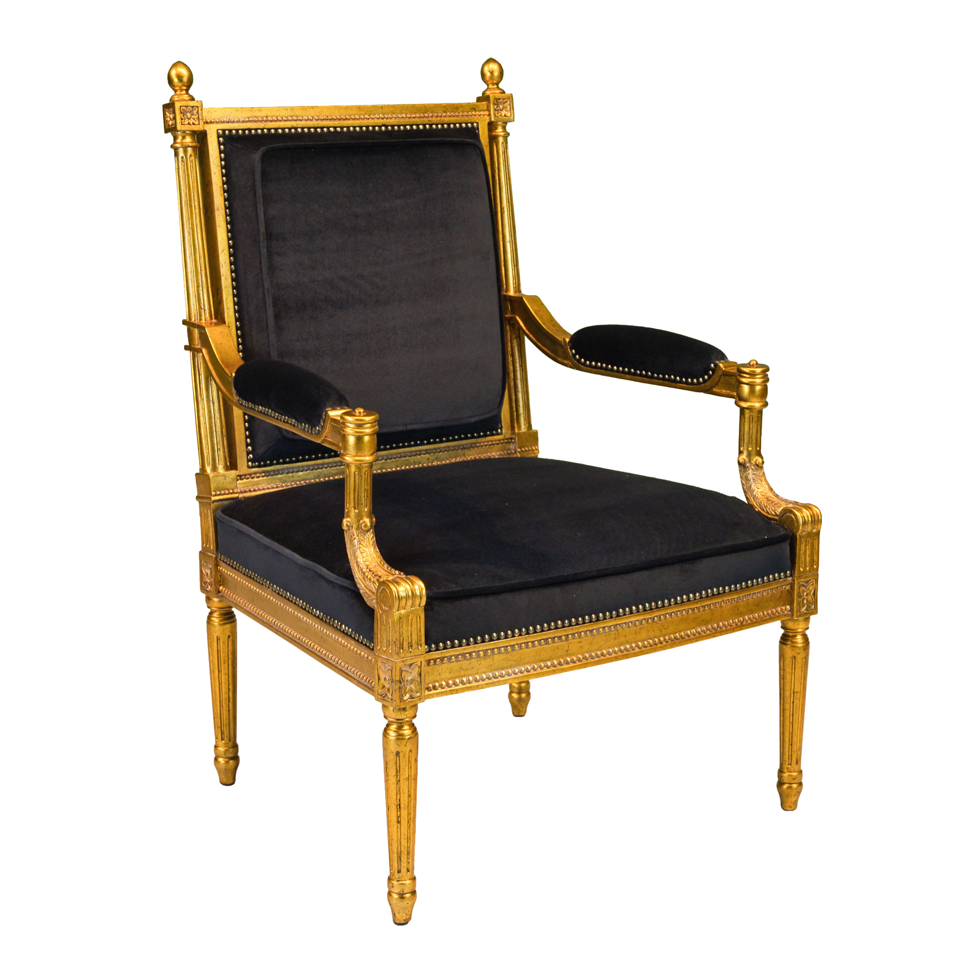 Louis XVI style arm chair, made of mahogany wood, with hand carved details, finished in an antiqued gold leaf with black velvet upholstery.