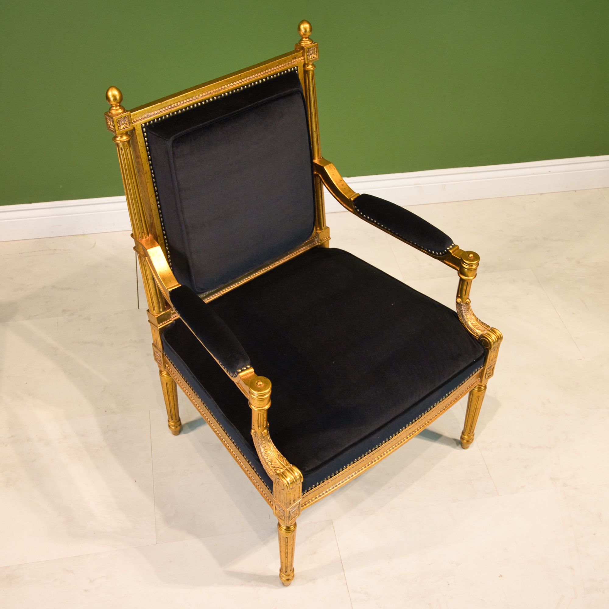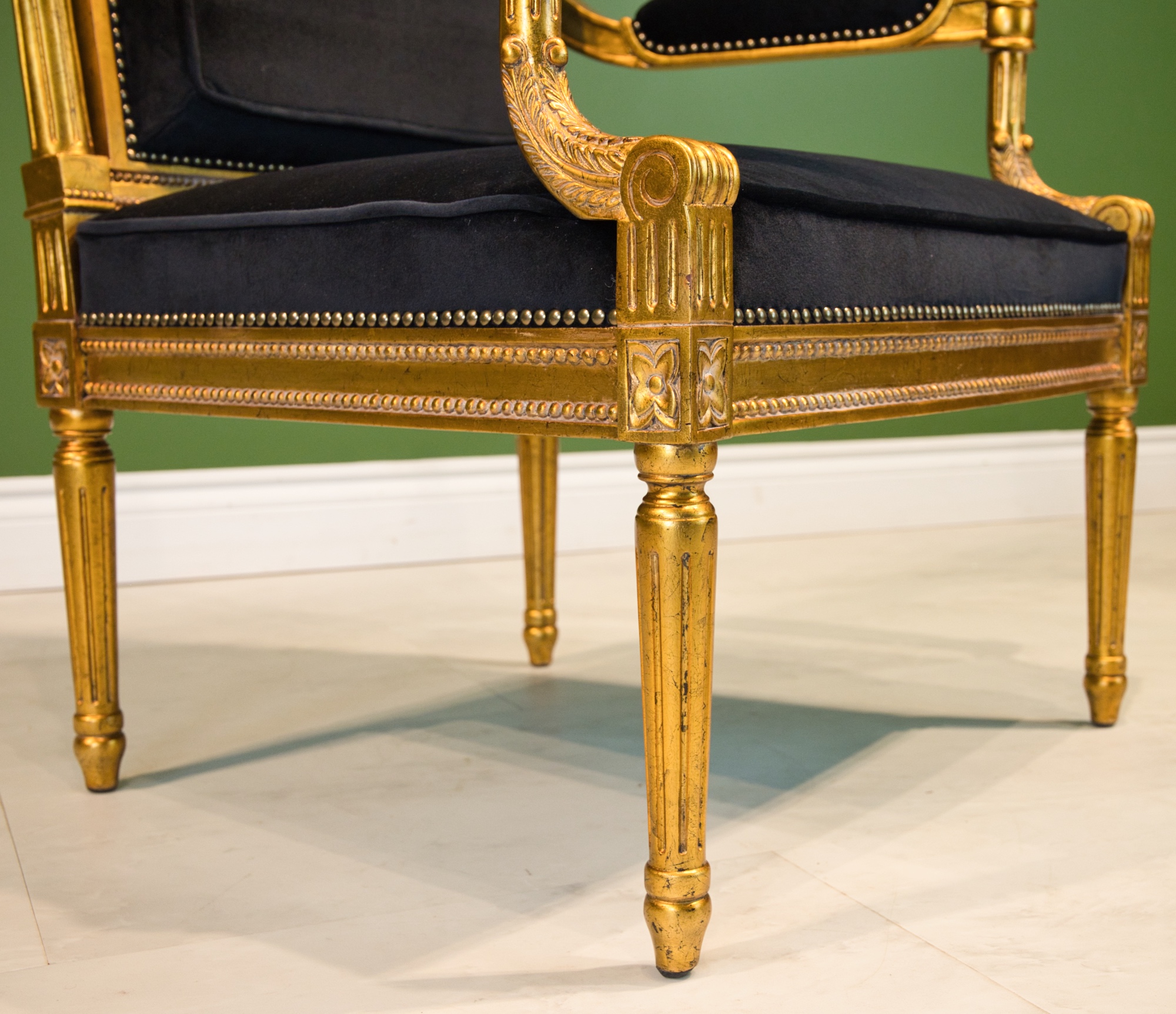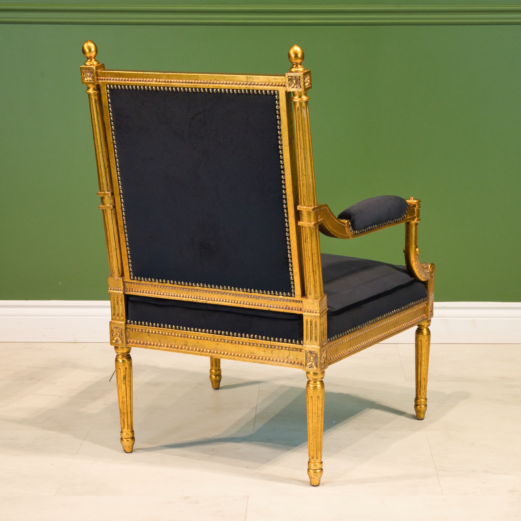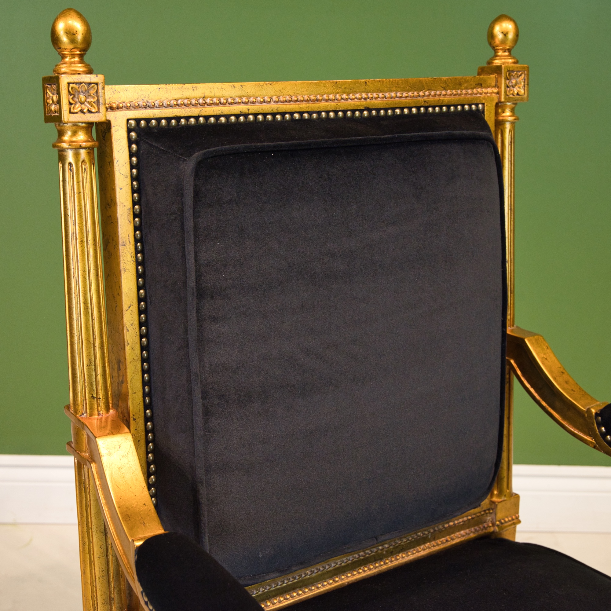 Louis XVI style arm chair, made of mahogany wood, with hand carved details, finished in an antiqued gold leaf with black velvet upholstery.