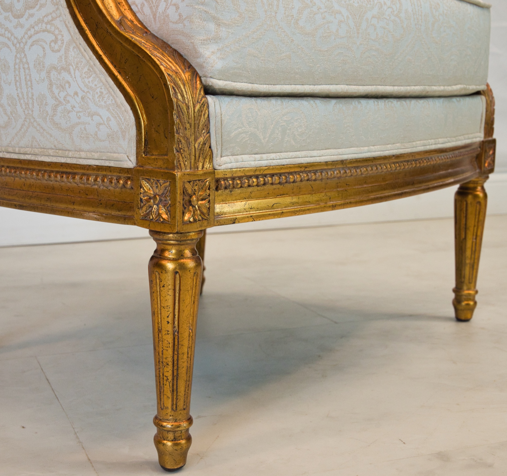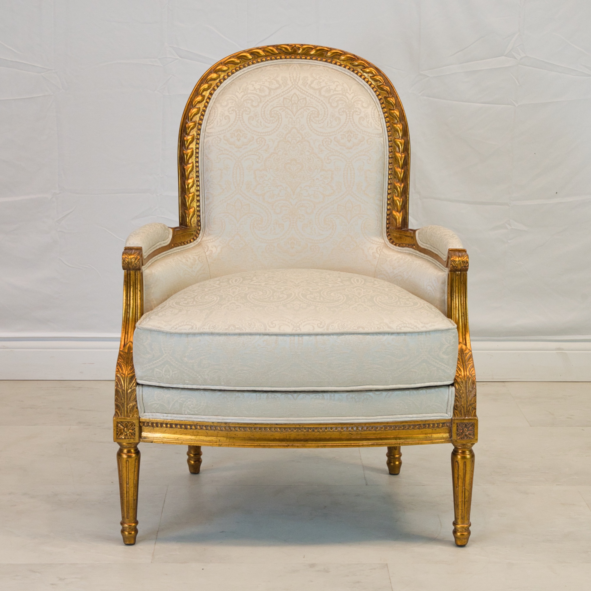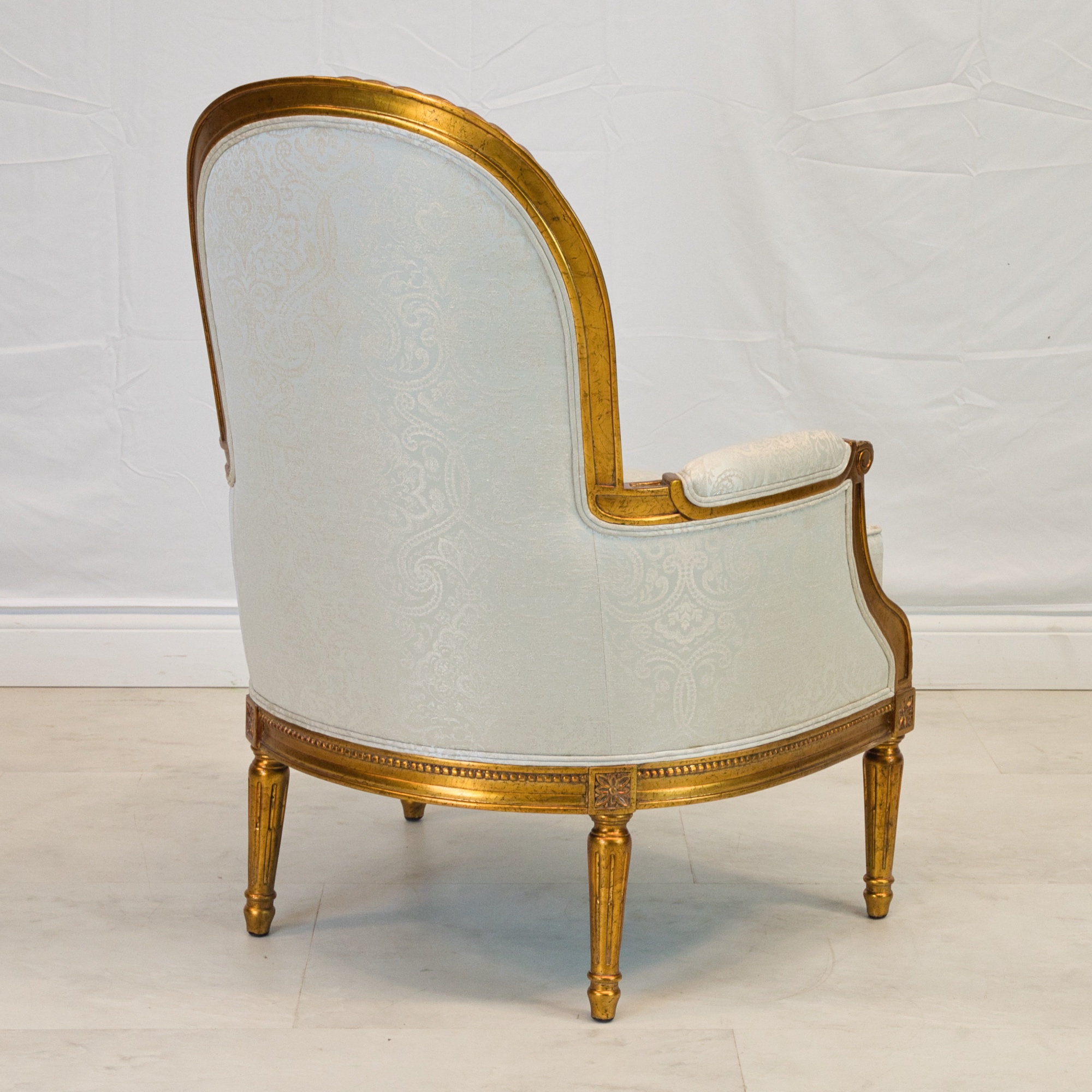 Louis XVI style Dauphin lounge chair, made of mahogany wood, hand carved, and finished in NF9 antiqued gold leaf with a silvery blue damask pattern upholstery.