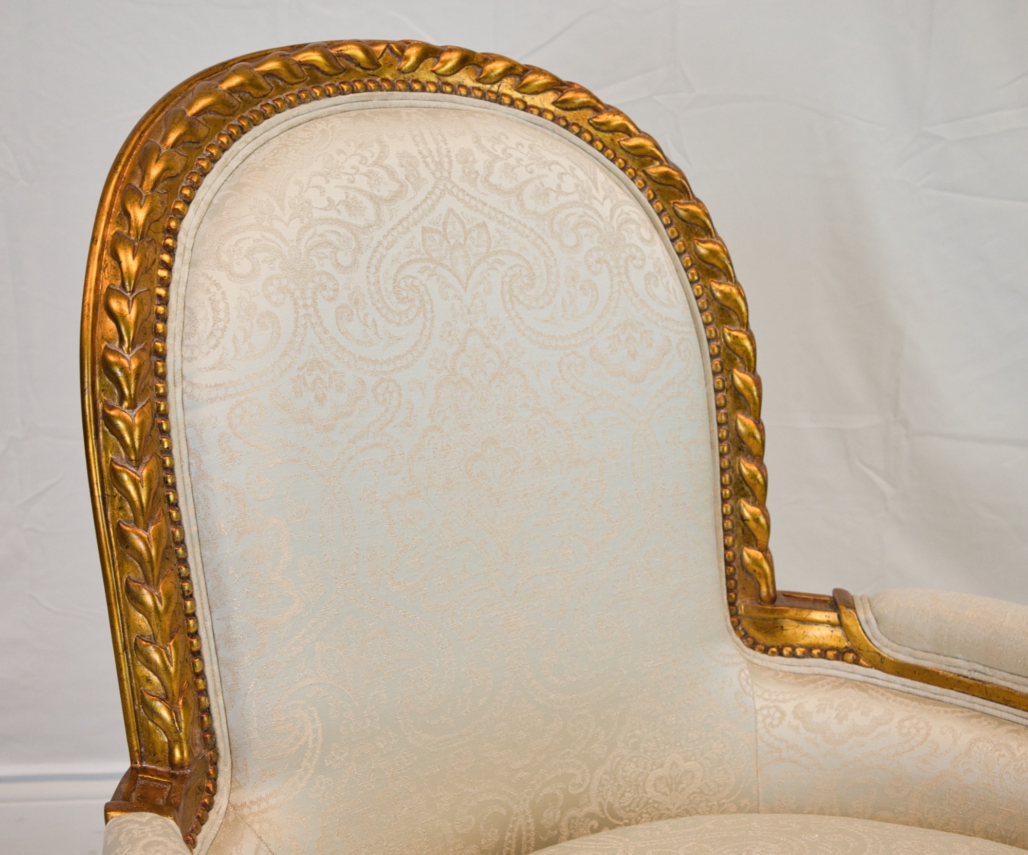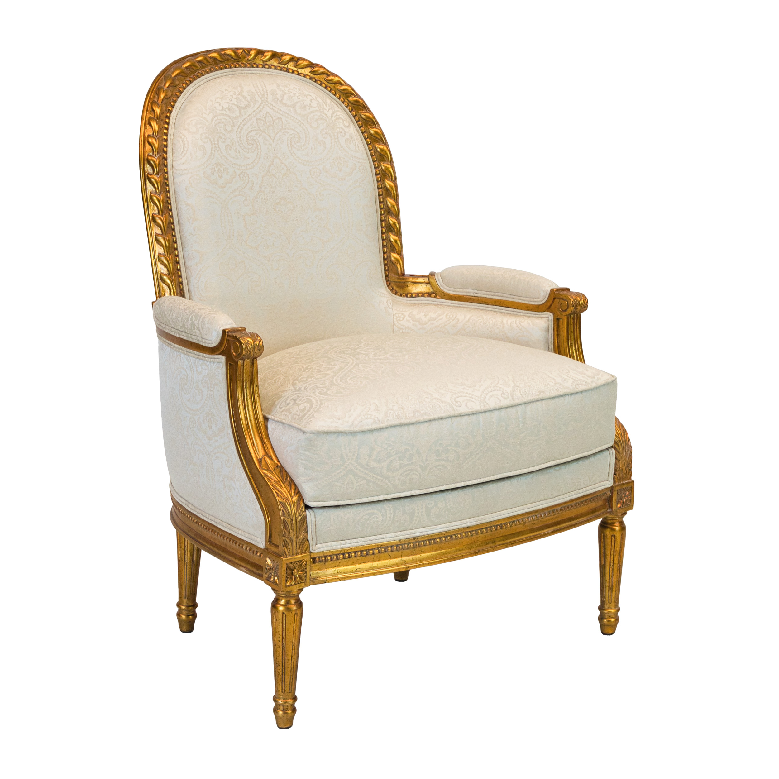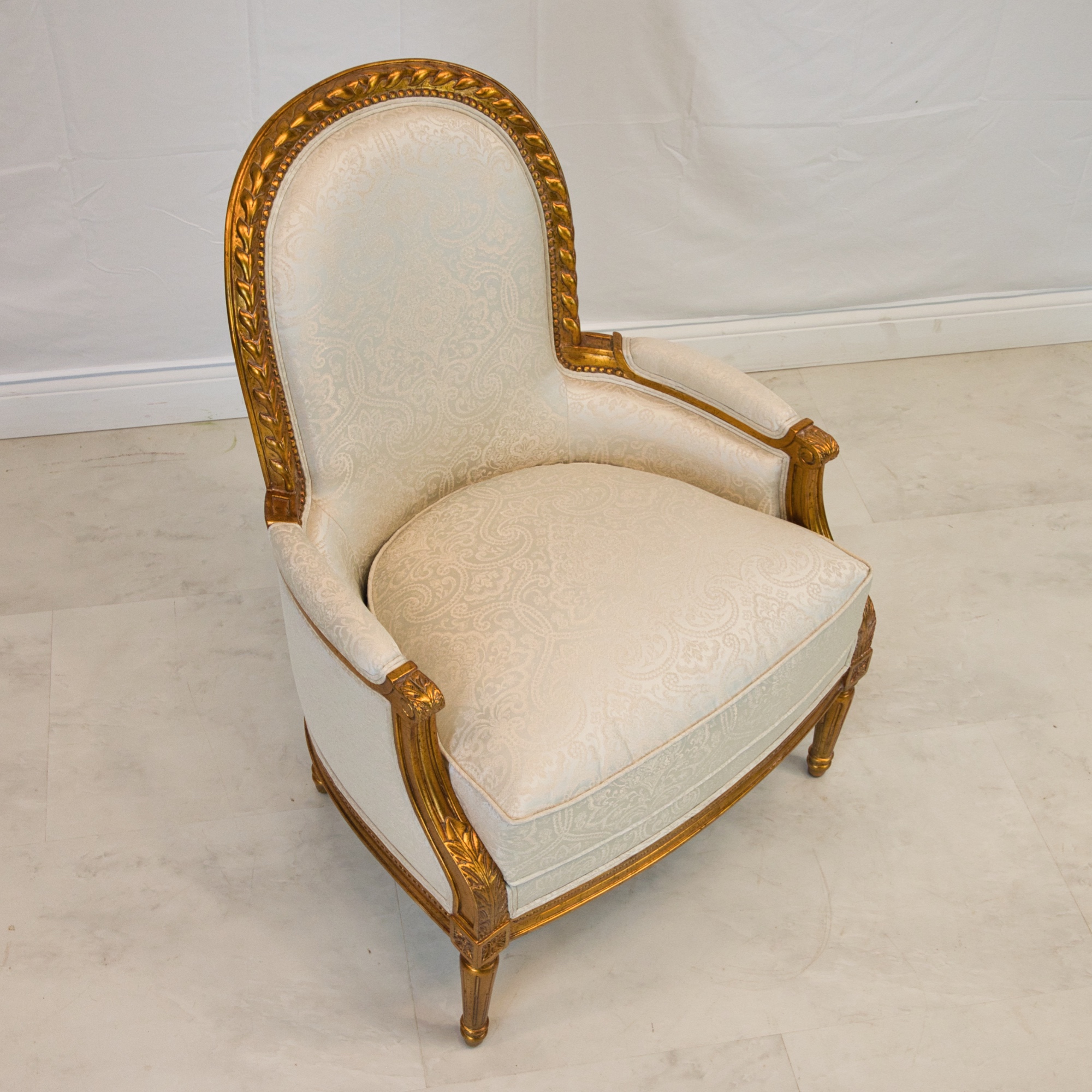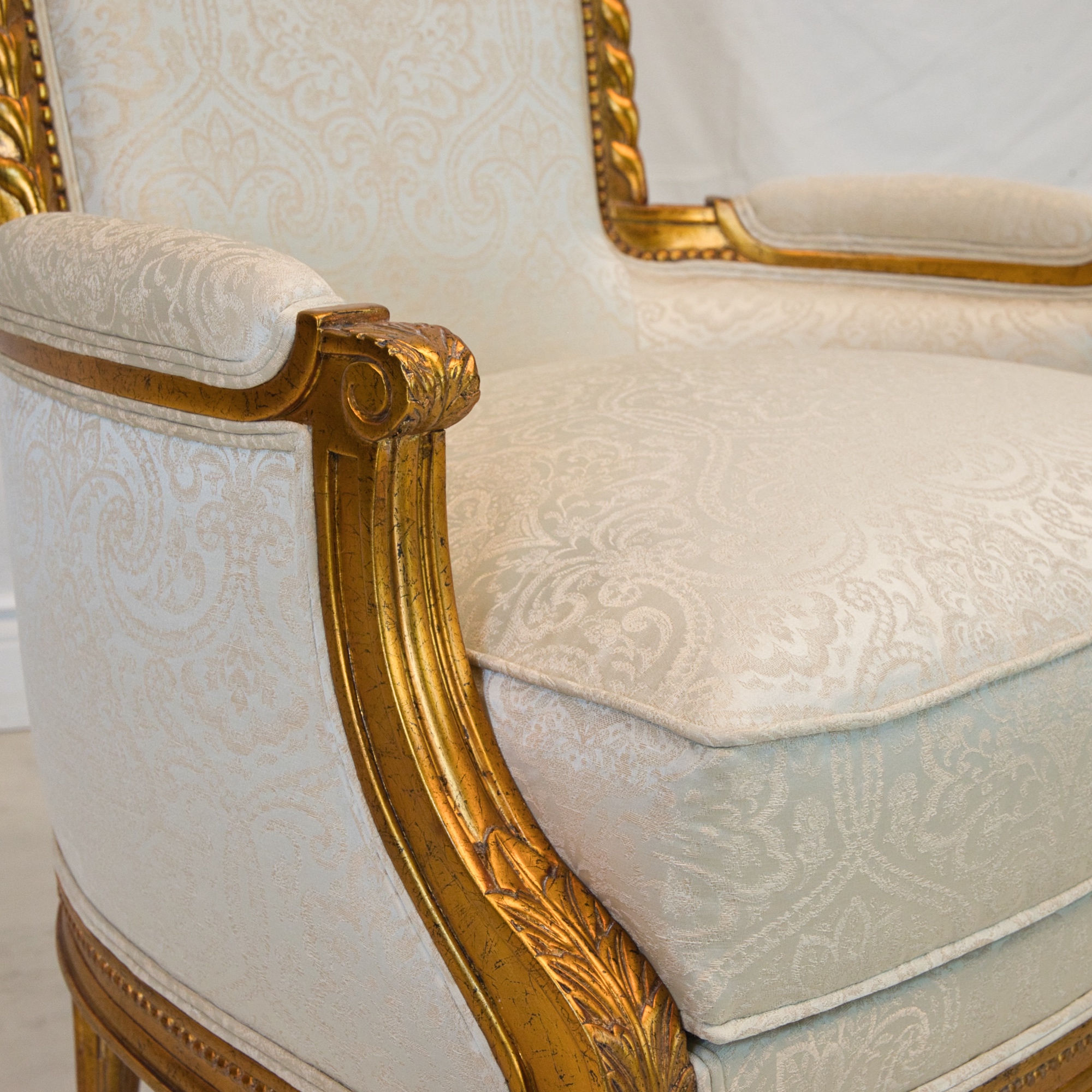 Louis XVI style Dauphin lounge chair, made of mahogany wood, hand carved, and finished in NF9 antiqued gold leaf with a silvery blue damask pattern upholstery.