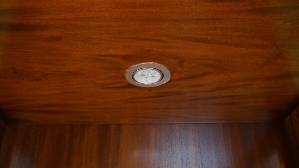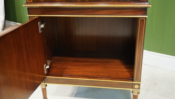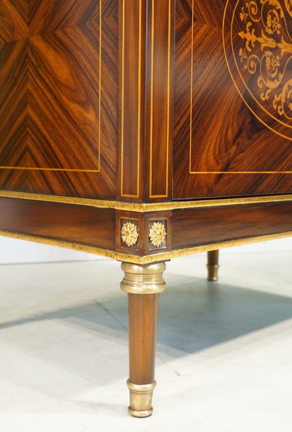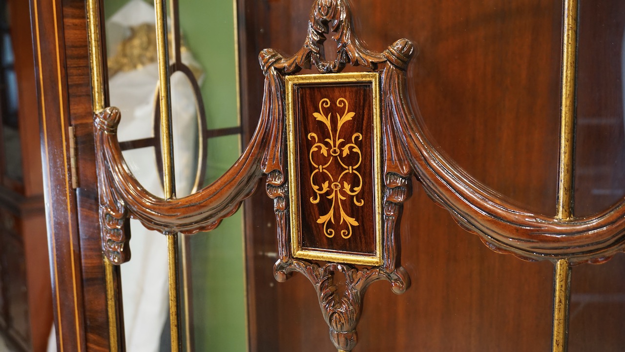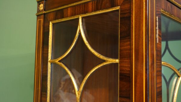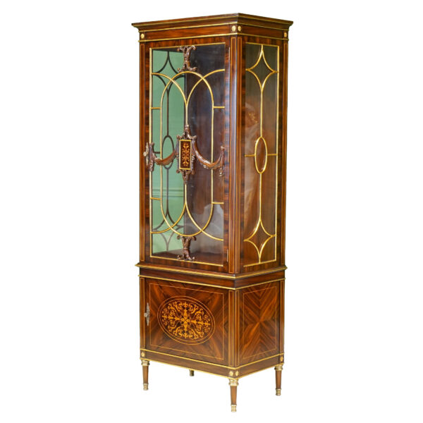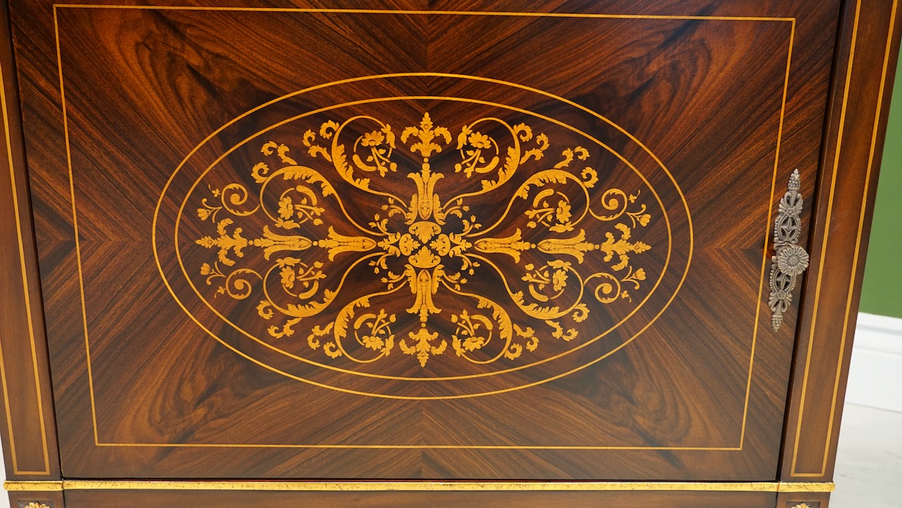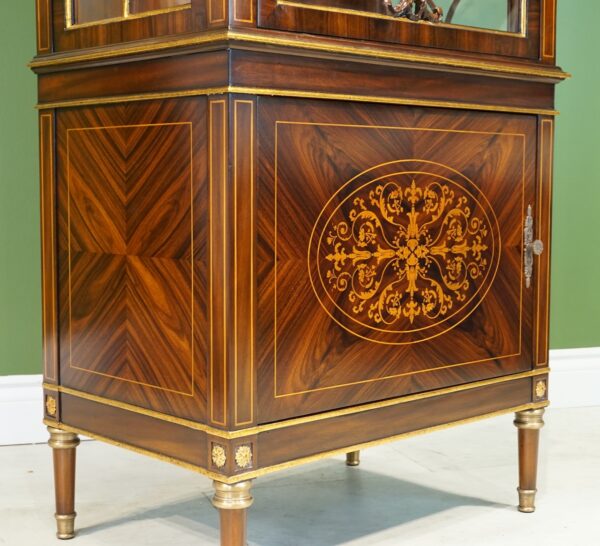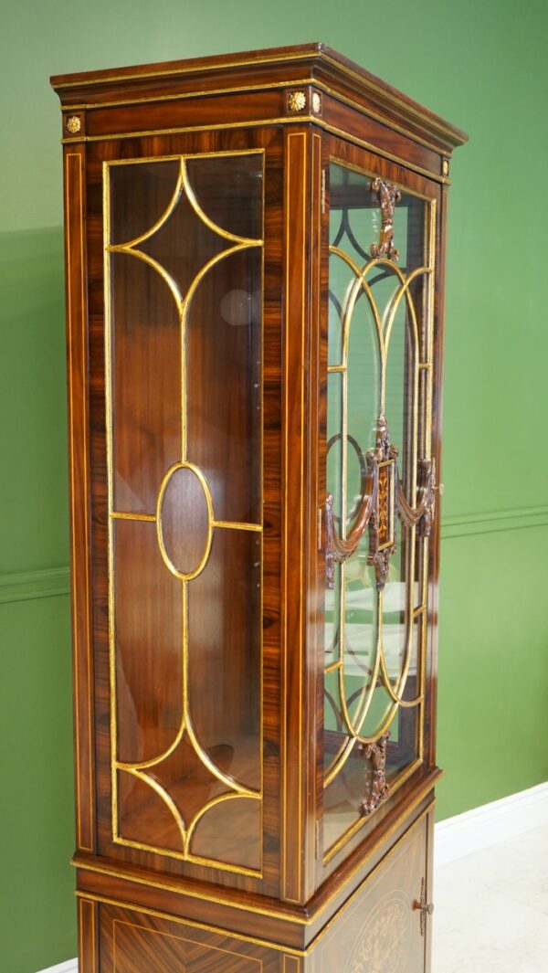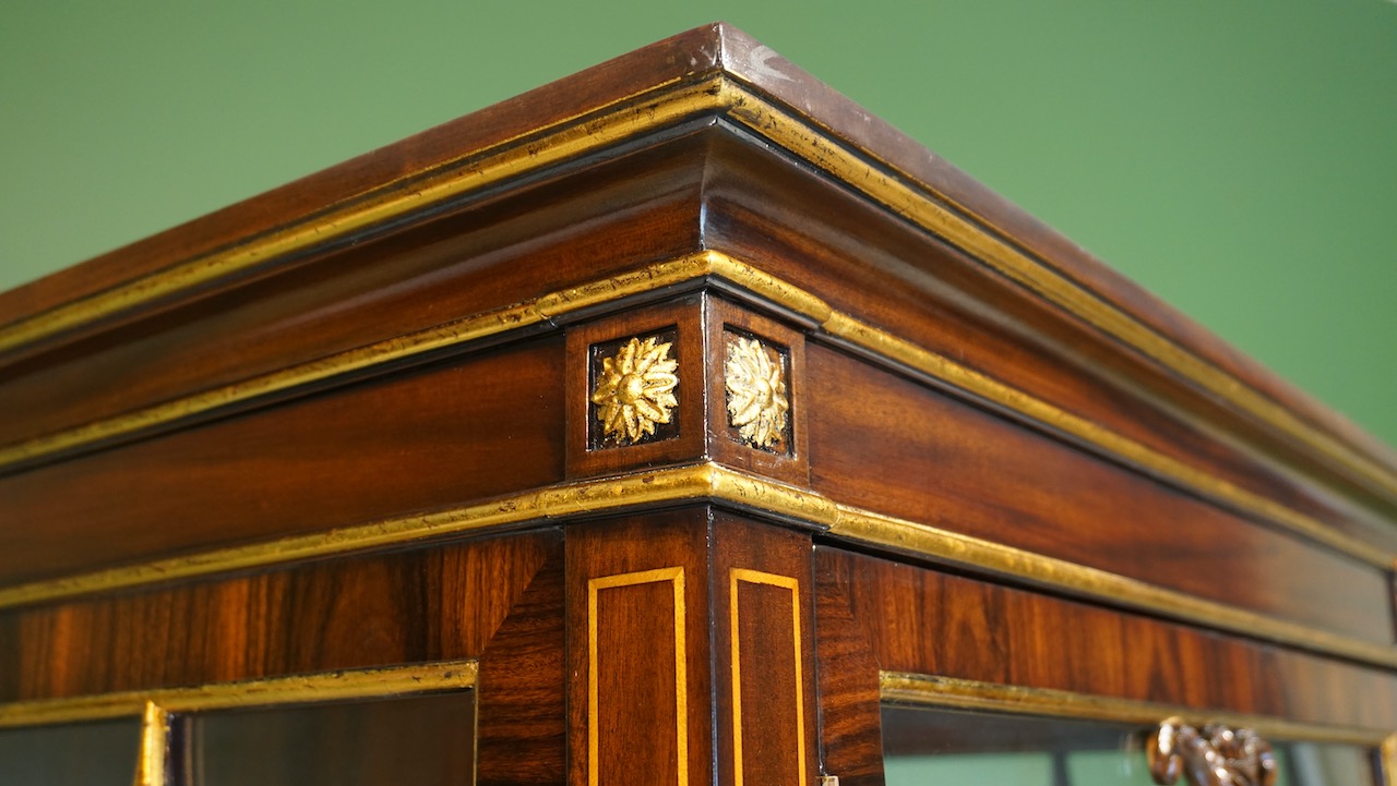 Beautiful Parma display cabinet, made of rosewood and mahogany, with stunning hand applied inlay in the bottom door and accents with hand applied gold leaf accenting. Features brass hardware and 3 glass shelves on the glass display portion with LED lighting in the top. Door opens to the right.