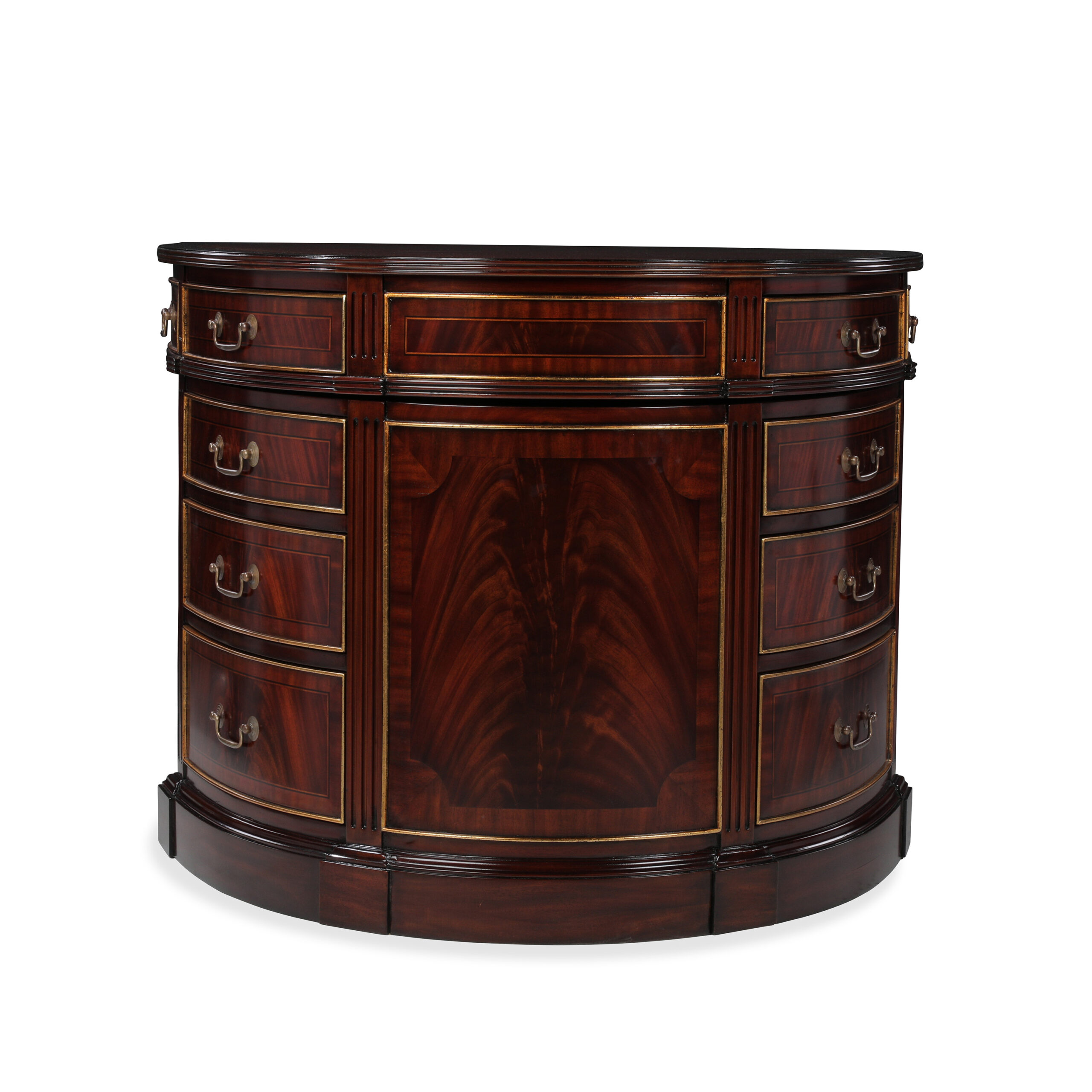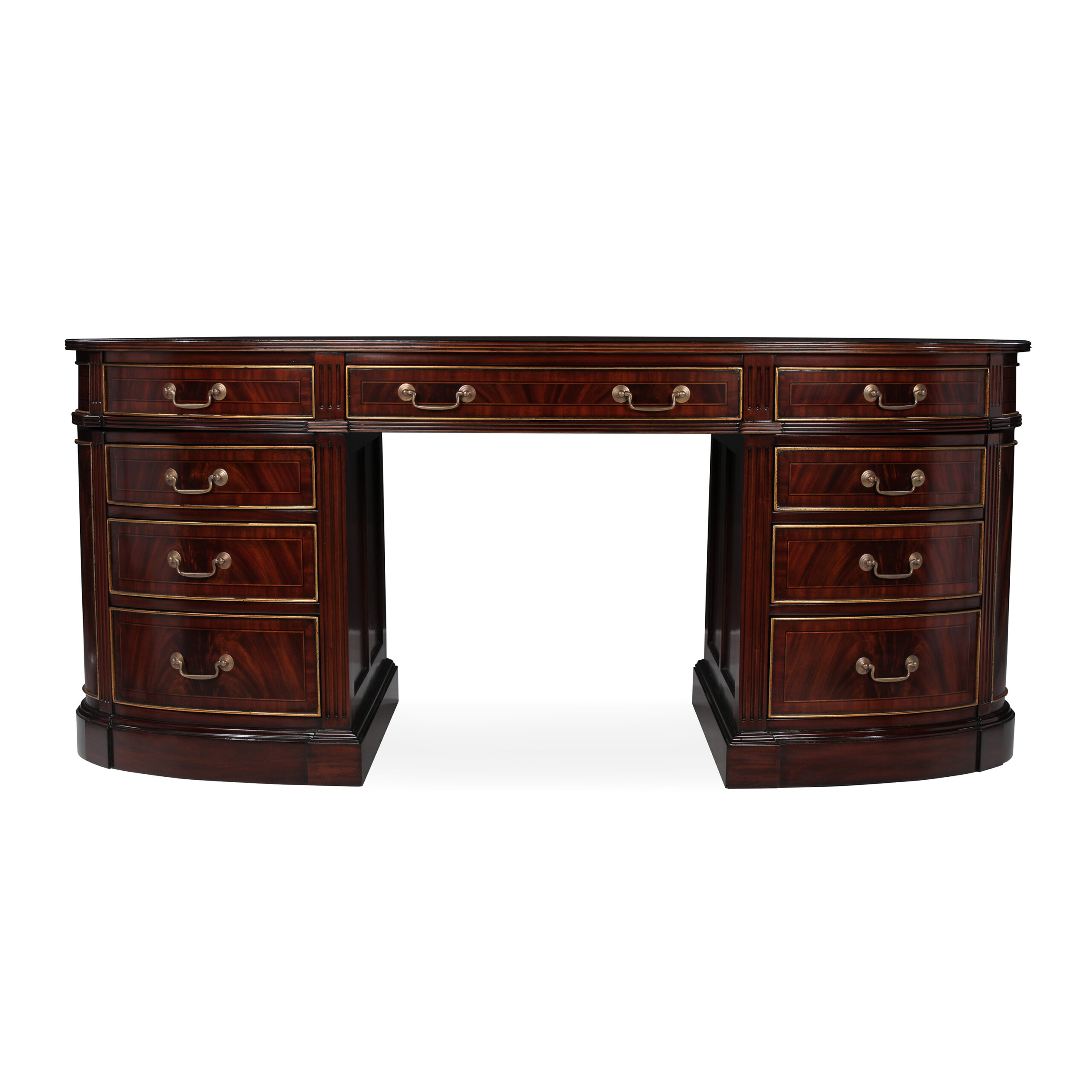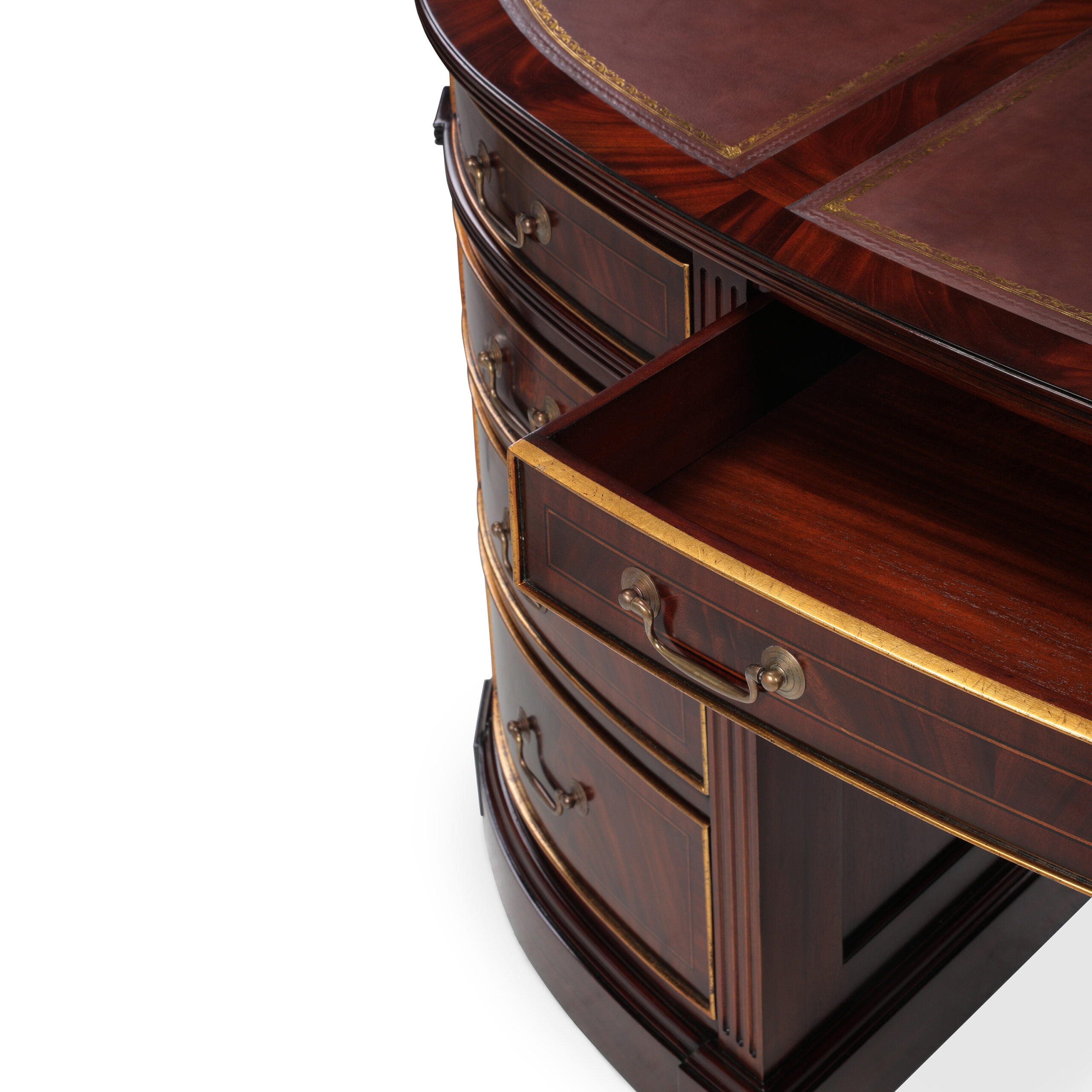 Oval partners double sided executive desk, made of flamed mahogany wood, with a genuine brown leather top, and hand applied gold leaf accents. This desk has mirror imaged drawers on both sides.