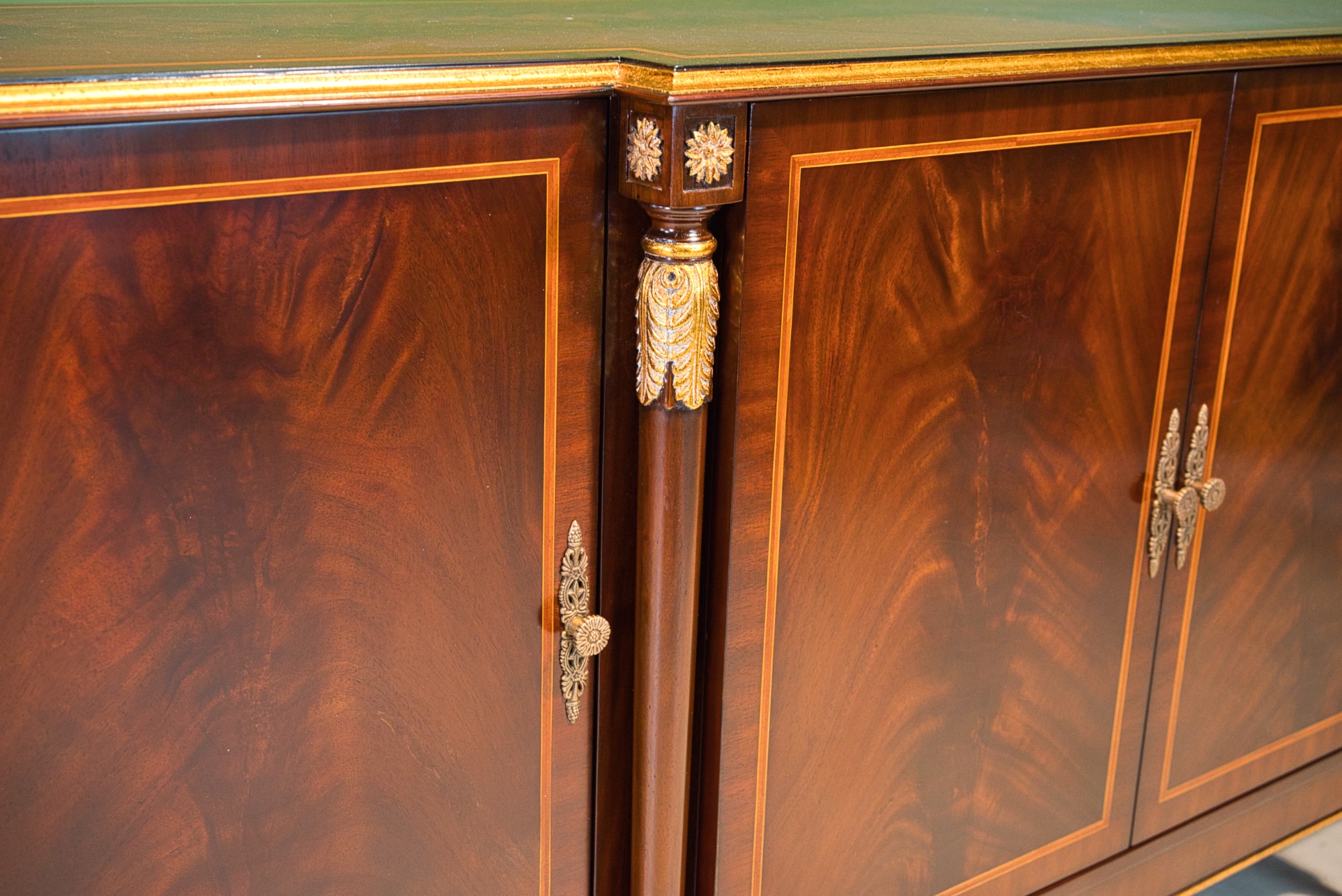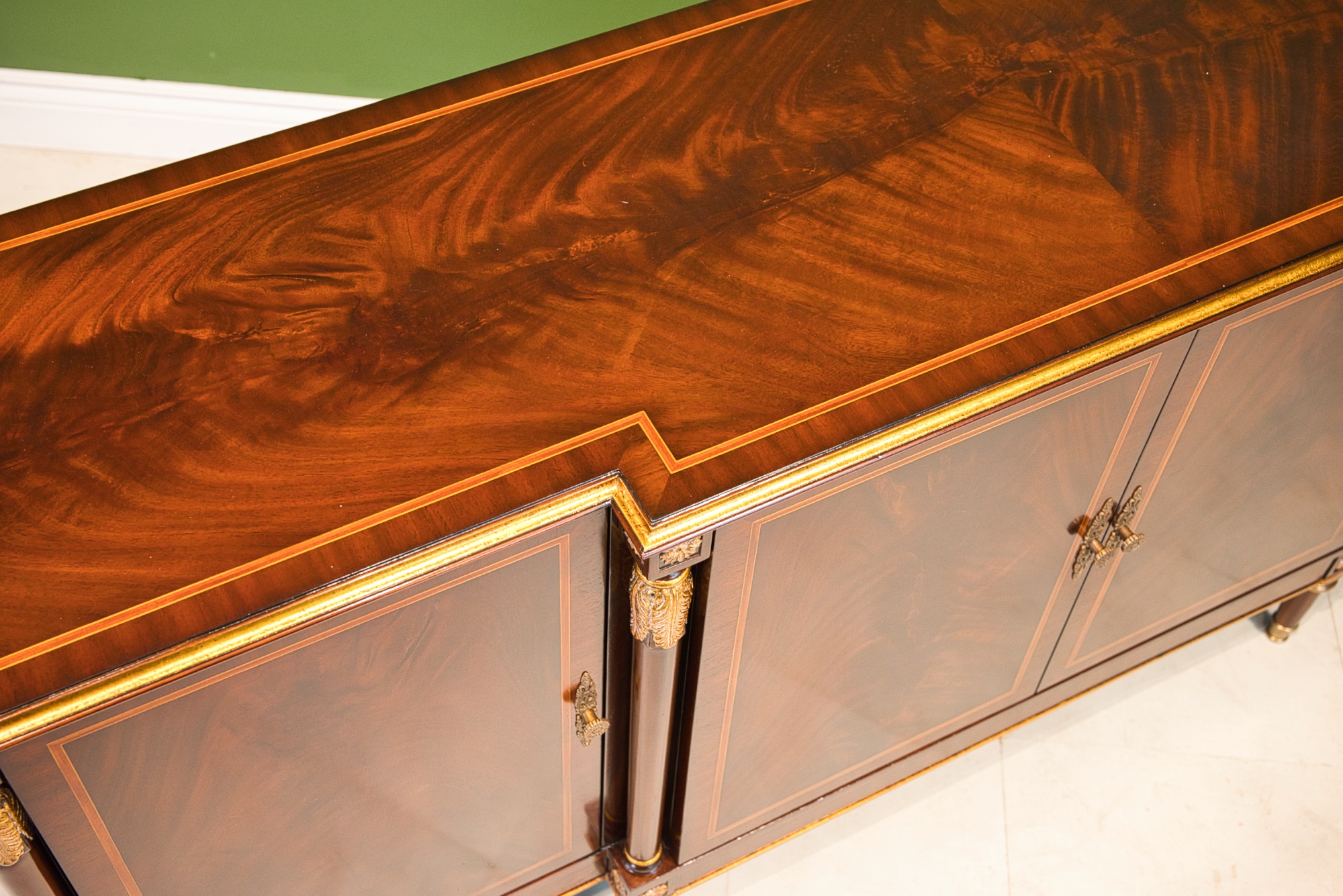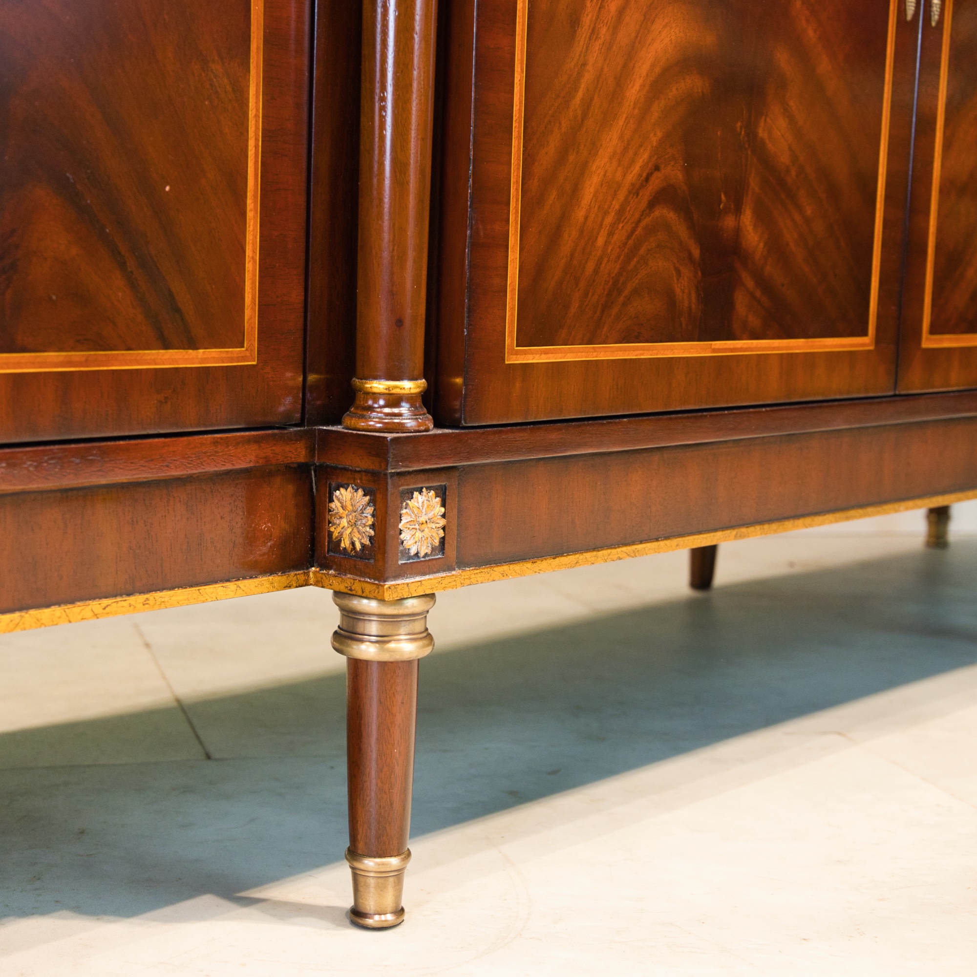 Stunning flamed mahogany Parma sideboard, made of mahogany wood with hand carved details. This piece features satinwood inlays, brass handles, and a single shelf inside each cabinet section. Finished in a medium brown semi gloss with hand applied gold leaf accenting.