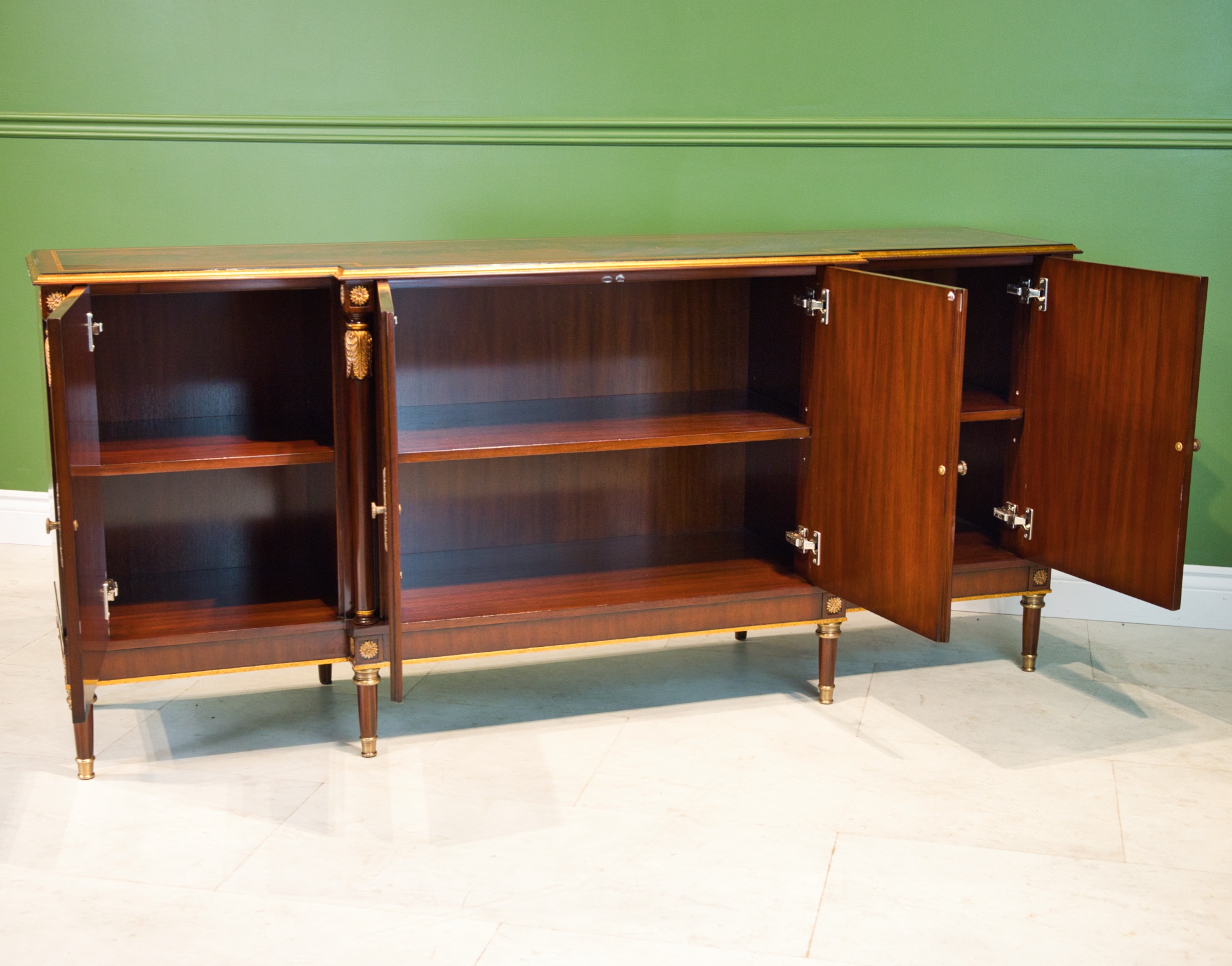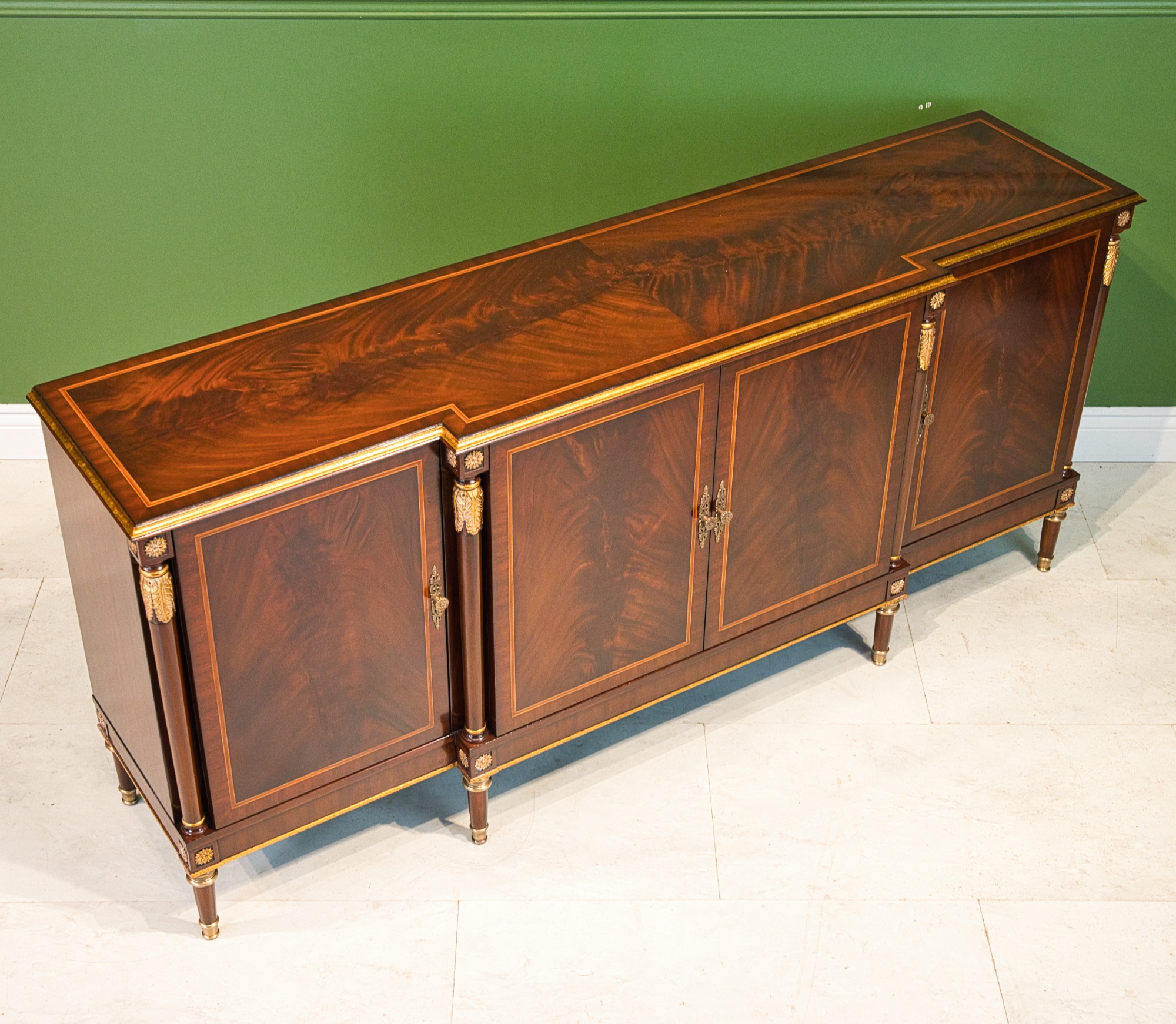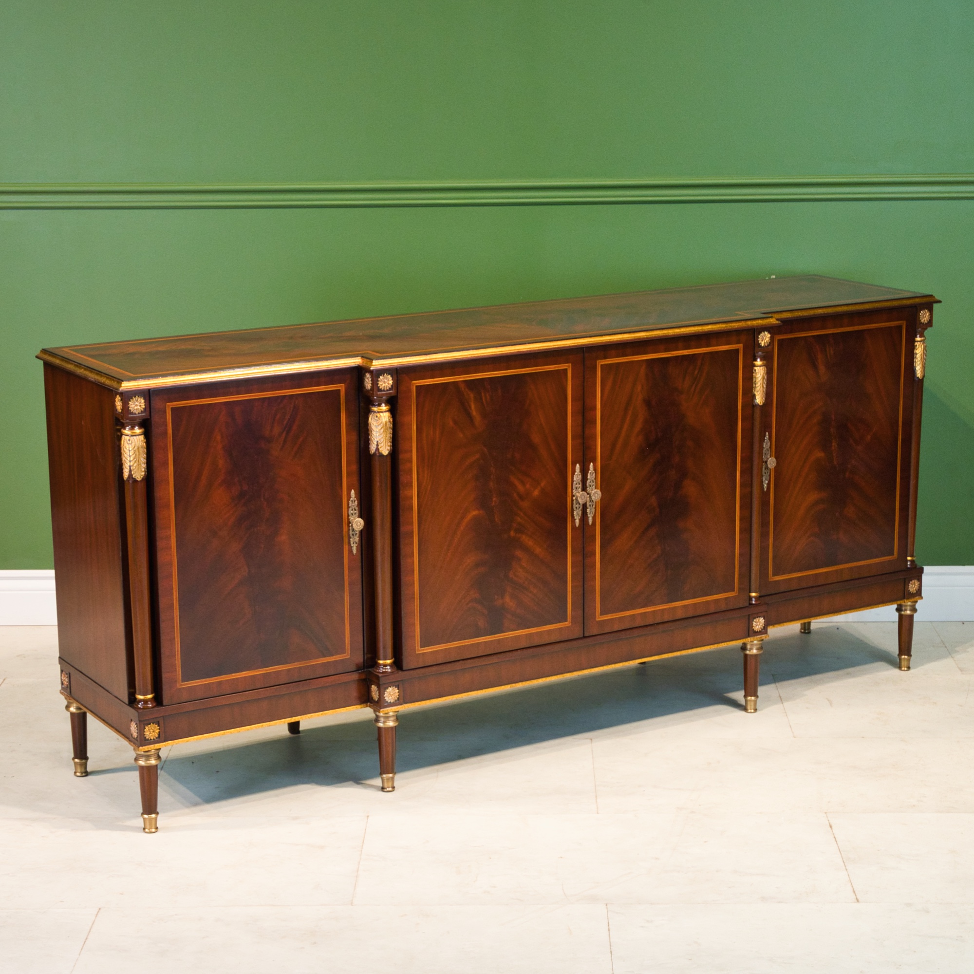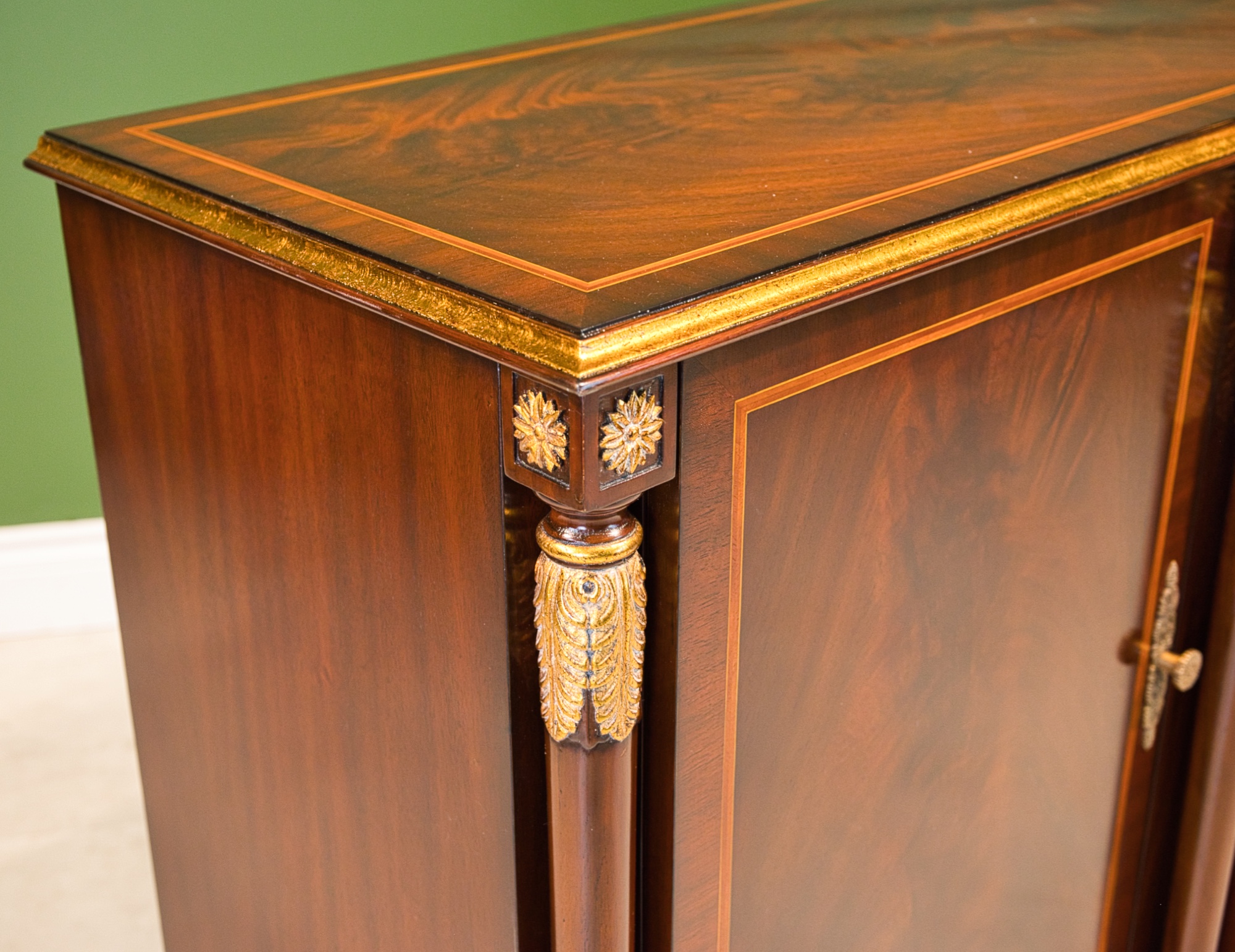 Stunning flamed mahogany Parma sideboard, made of mahogany wood with hand carved details. This piece features satinwood inlays, brass handles, and a single shelf inside each cabinet section. Finished in a medium brown semi gloss with hand applied gold leaf accenting.