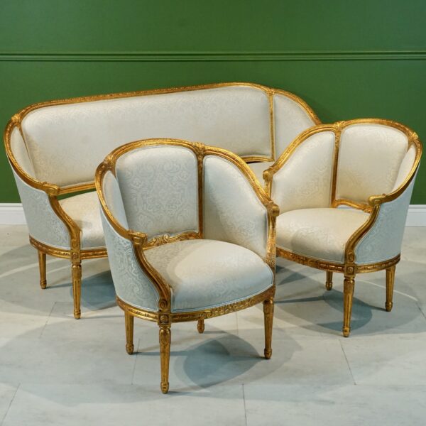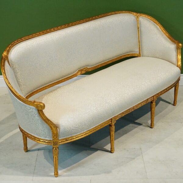 SOFA PARIS in Louis XVI style with hand carved rosettes and acanthus leaves, made of mahogany wood finished in an antiqued gold leaf with silvery teal damask fabric. Matching love seat 33450, chair 33449 coffee table 33456L and side tables 33482 and 33782.